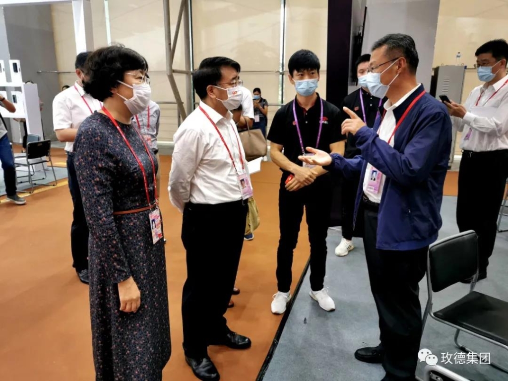 山东省商务厅厅长张德平、副厅长吕伟及济南市副市长尹清忠莅临玫德集团展位,询问公司发展情况。何庆总监赠送玫德集团60周年庆徽章。