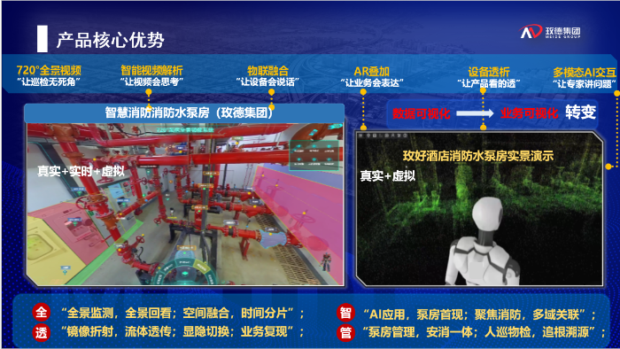 玫德智慧泵房四维空间融合系统,依托人工智能、AR/VR及720°全景视频技术深度融合,构建起一套全方位、全流程、全维度的泵房智能管理体系,更是AR+全景视频技术在流体输送领域的首例实战应用,也是AI技术在水泵房场景中的首例深度应用,开创了智慧消防水泵房场景应用的新范式。